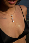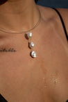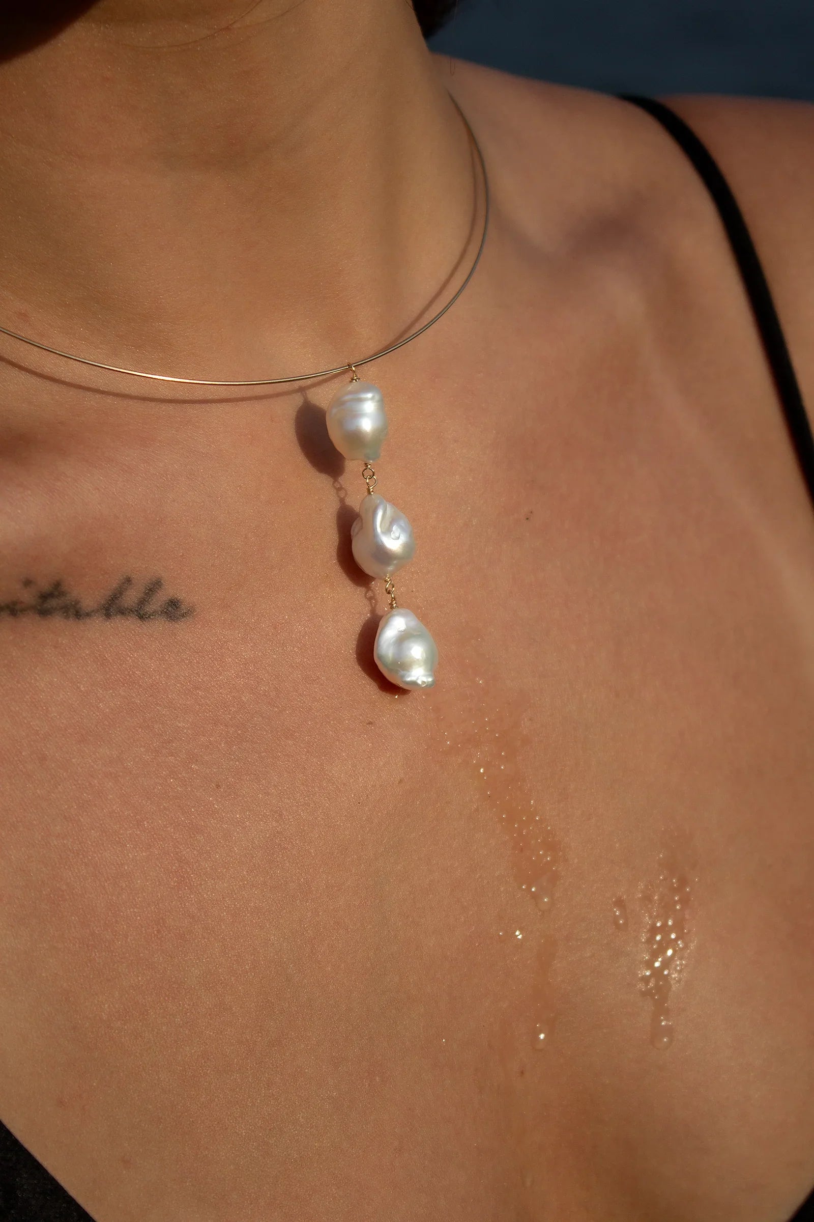 A minimalist neck ring featuring a trio of baroque pearls.  A simple way to make a statement.