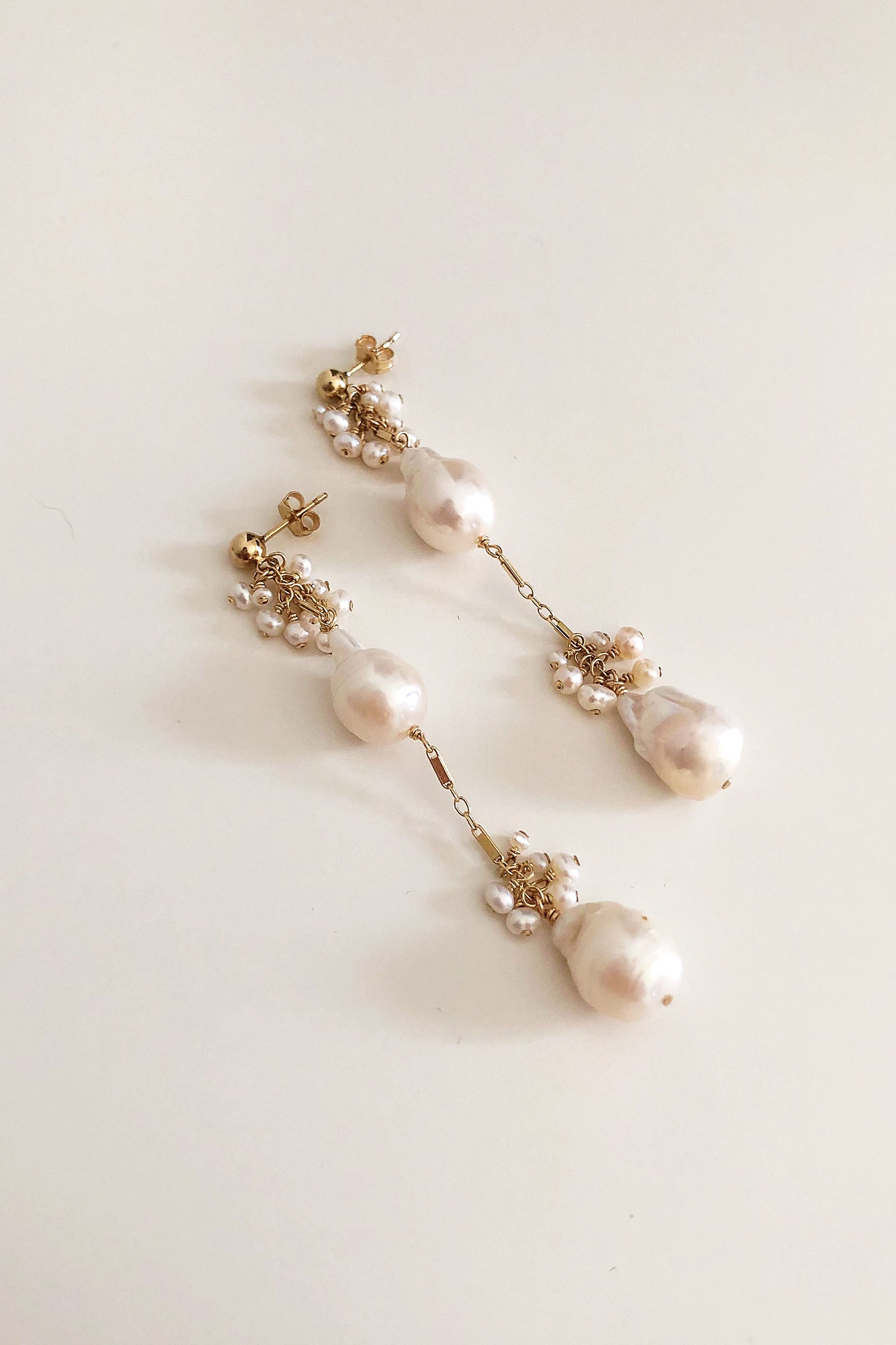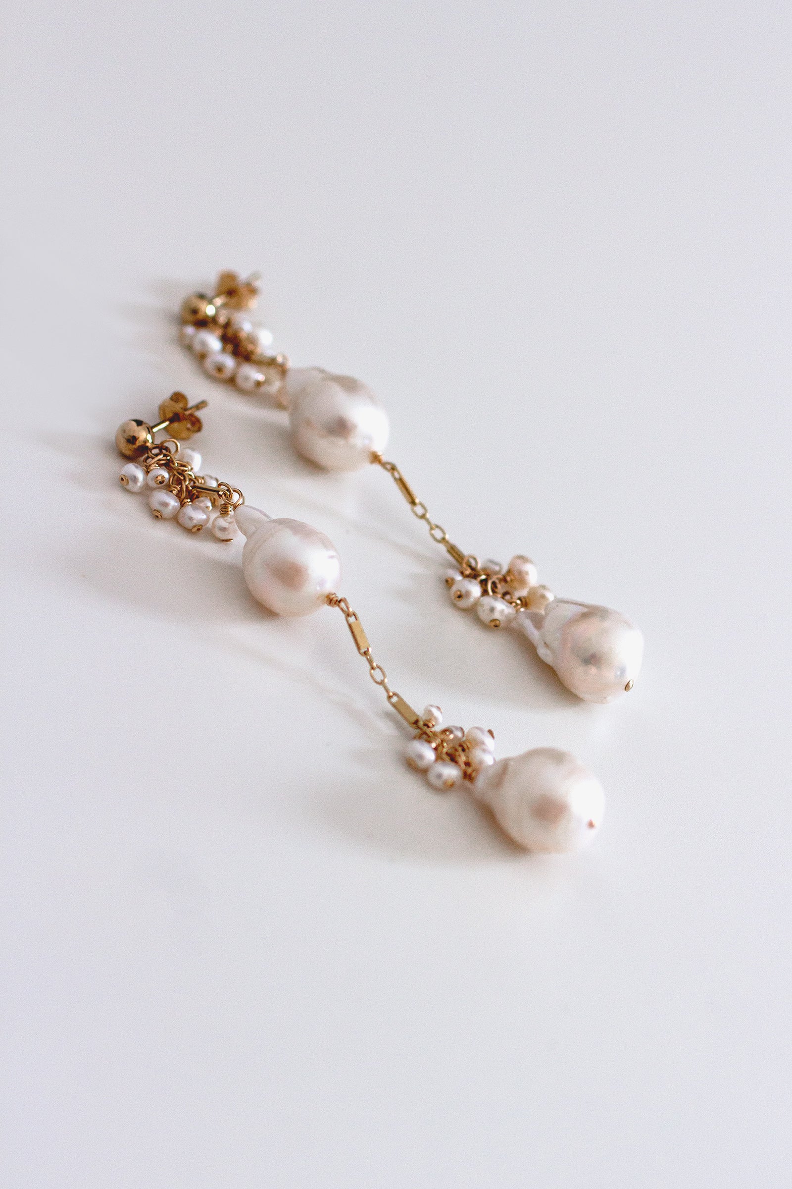 These earrings feature two genuine baroque freshwater pearls suspended from a dainty chain, adorned with signature freshwater pearl clustering.  They make a great statement while still being comfortable to wear.  Comfortable to wear.
