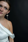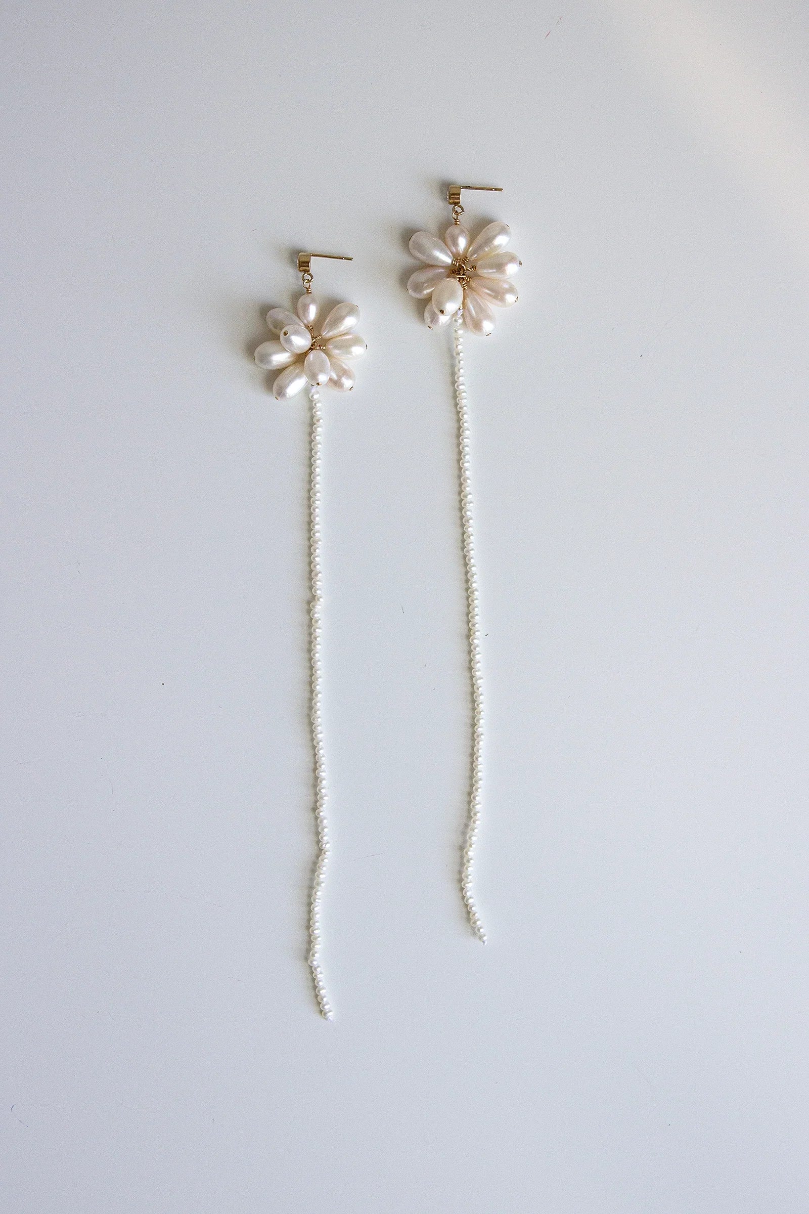 Inspired by a simple floral stem, these earrings gracefully fall from cubic zirconia posts.  The ends feature a delicate strand of seed pearls that effortlessly sweep your shoulders.  Lightweight and easy to wear.