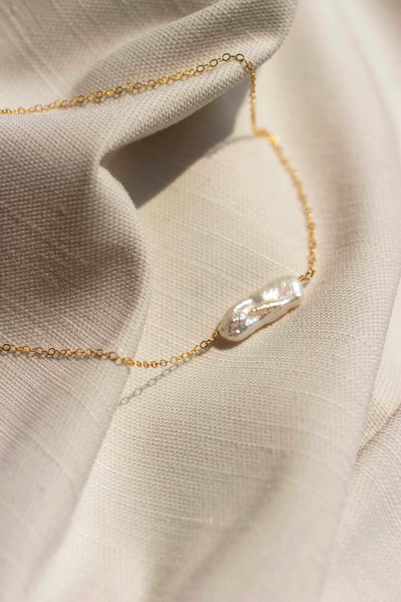 Completely handcrafted in our New York studio, the Biwa Solitaire Necklace features a single freshwater biwa pearl. Due to the nature of pearls, each one is slightly different and unique to you.