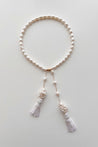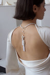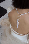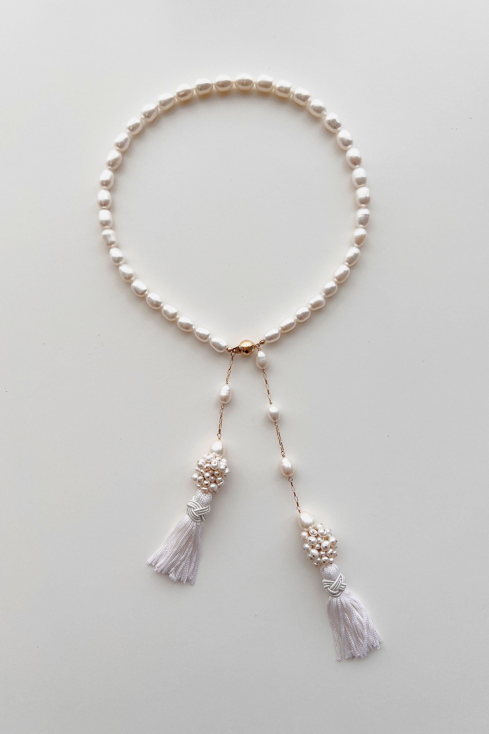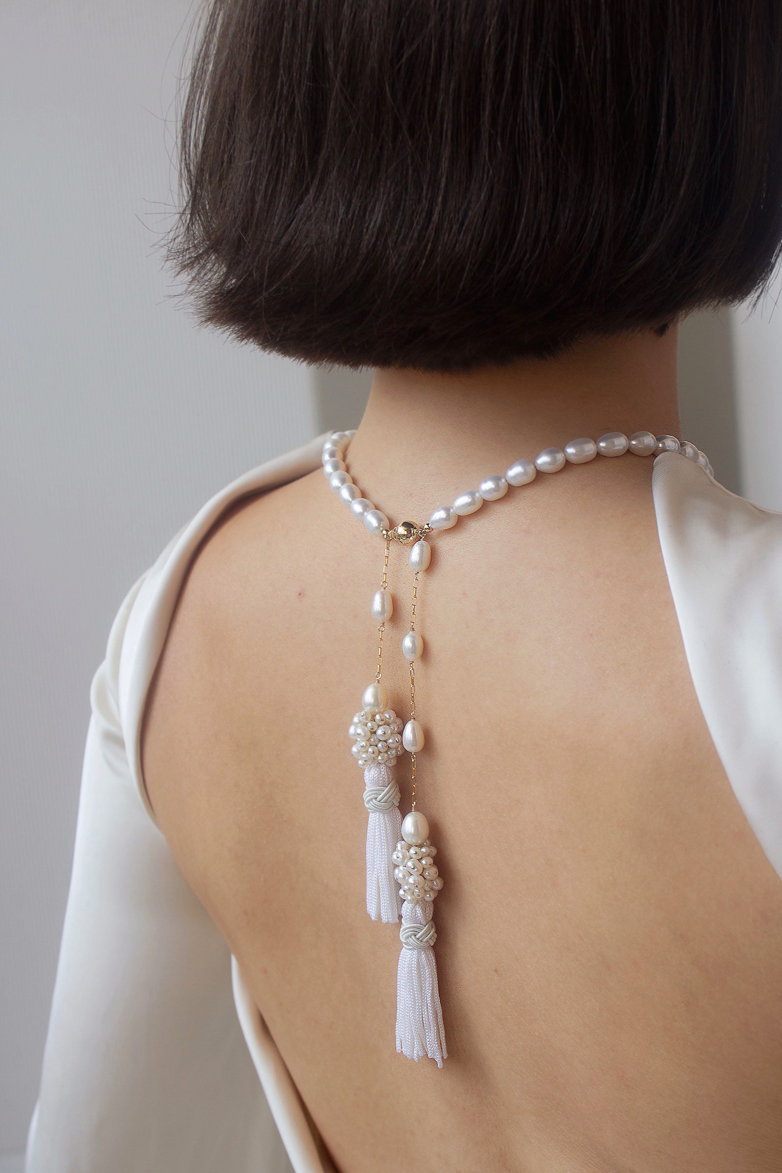 A decadent choice for any occasion!   A classic pearl necklace gets an update with a sleek modern closure, freshwater pearl and tassel strands that elegantly fall down the back.  A truly unique statement piece.